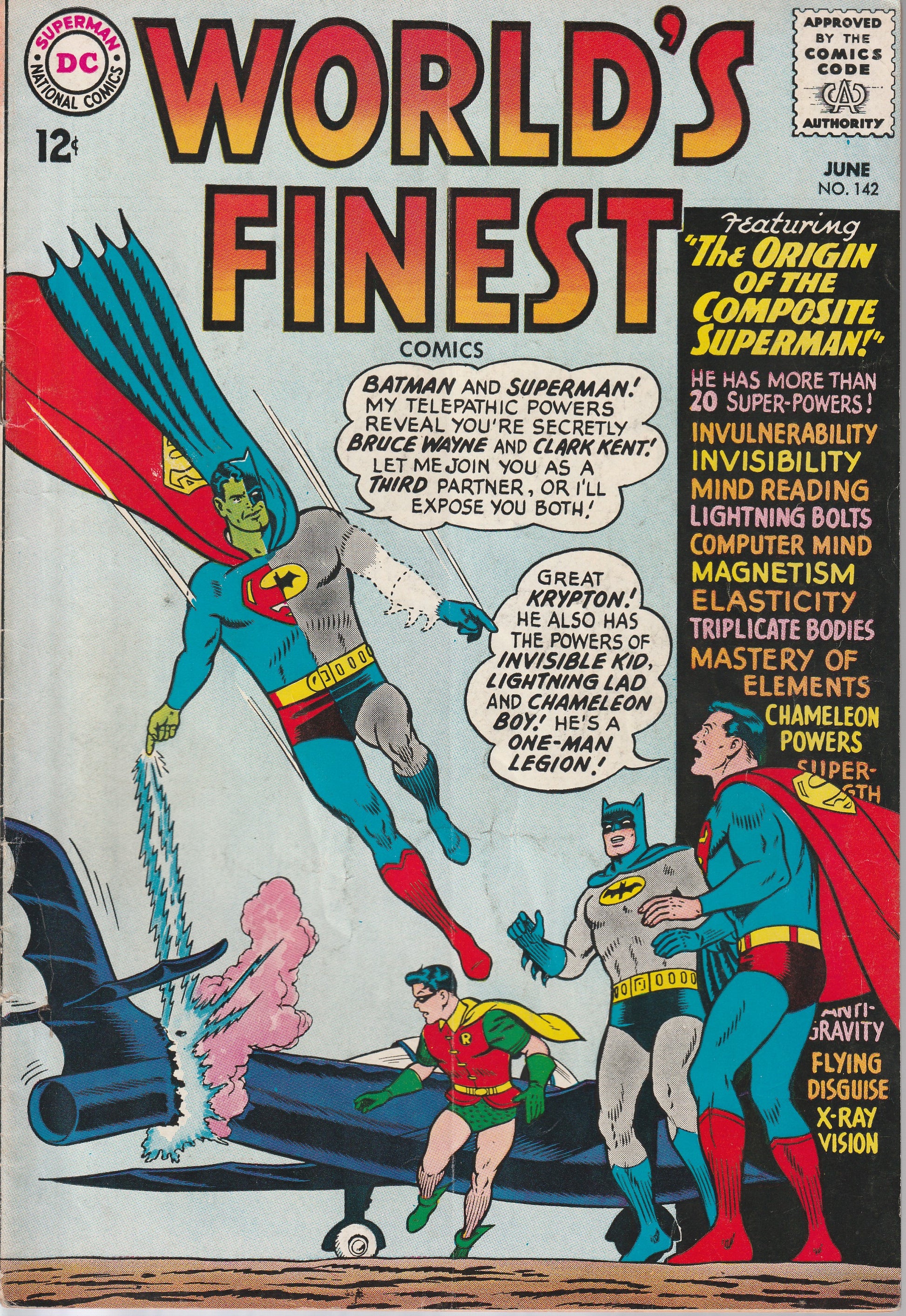A freak accident gives Joe Meach the powers of the entire Legion of Super-Heroes and he becomes the Composite Superman. With power exceeding Superman's he seems about to conquer the two heroes, but his powers begin to fade. Unable to reproduce the original lightning strike he loses power and memory both. Batman and Superman are bewildered as to why the Composite Superman fled... where he went... or who he is.; A Kryptonian Flame-Dragon makes its way to Earth. When it swallows a Red Kryptonite meteor Superman must stay away from the Flame-Dragon for fear the Red Kryptonite will affect him also. Superman tricks it into exhausting its flame, then freezes it and tosses it into space. He tricks Lois Lane by relying on Krypto, Batman, and Supergirl to protect his secret identity.; Tricksy's new assistant is so hungry, he leaves the trapeze for lunch without catching Tricksy.